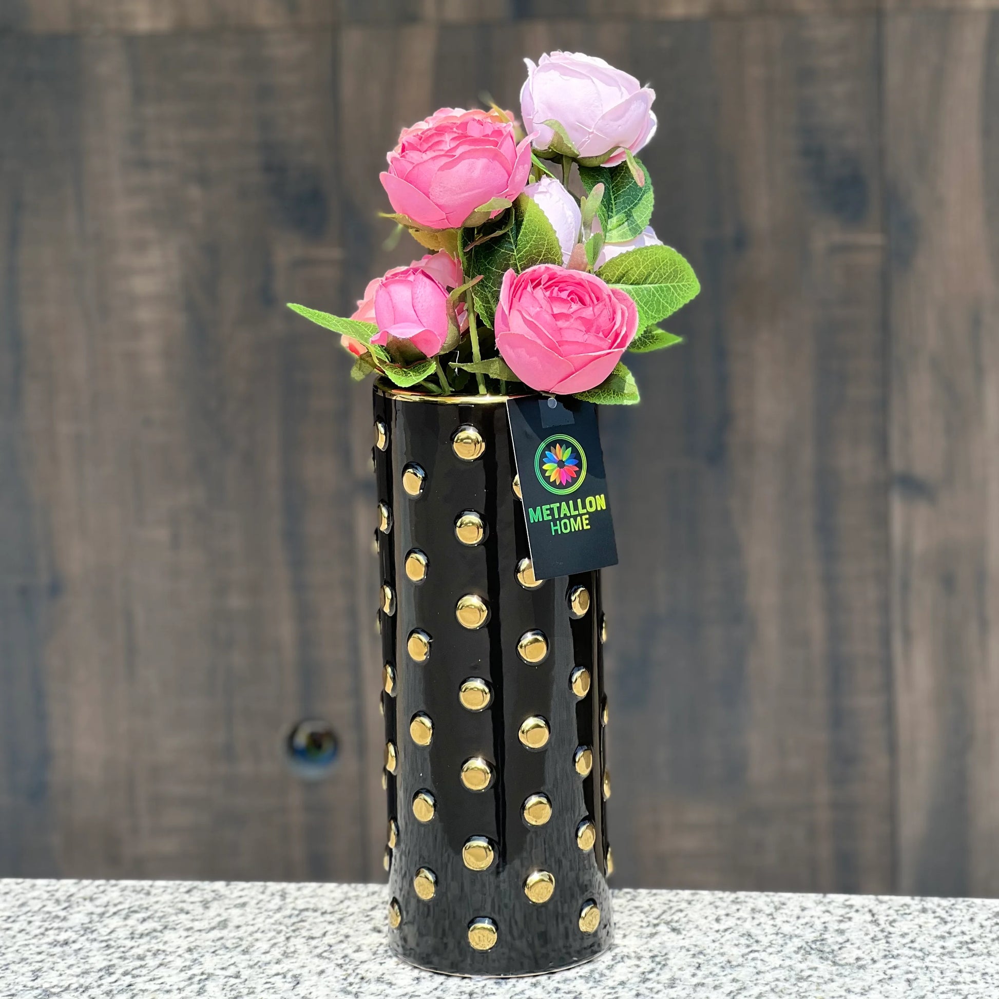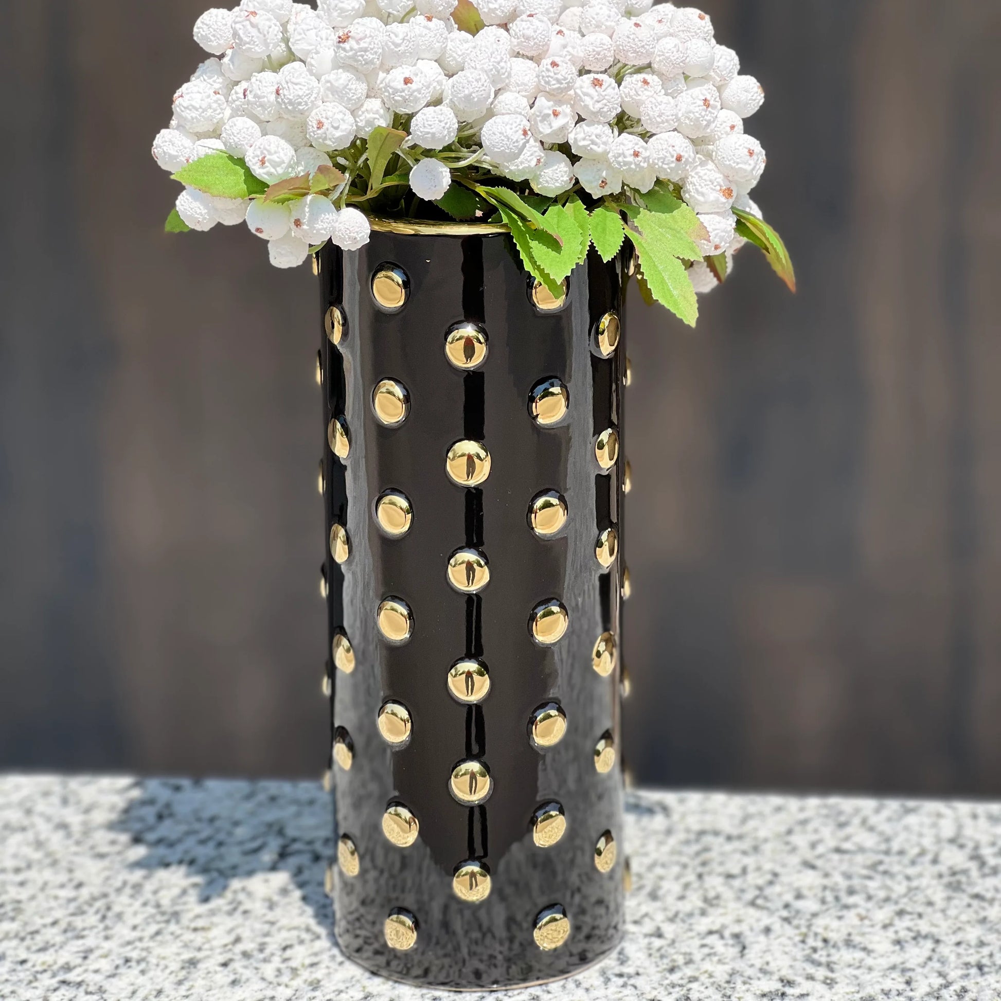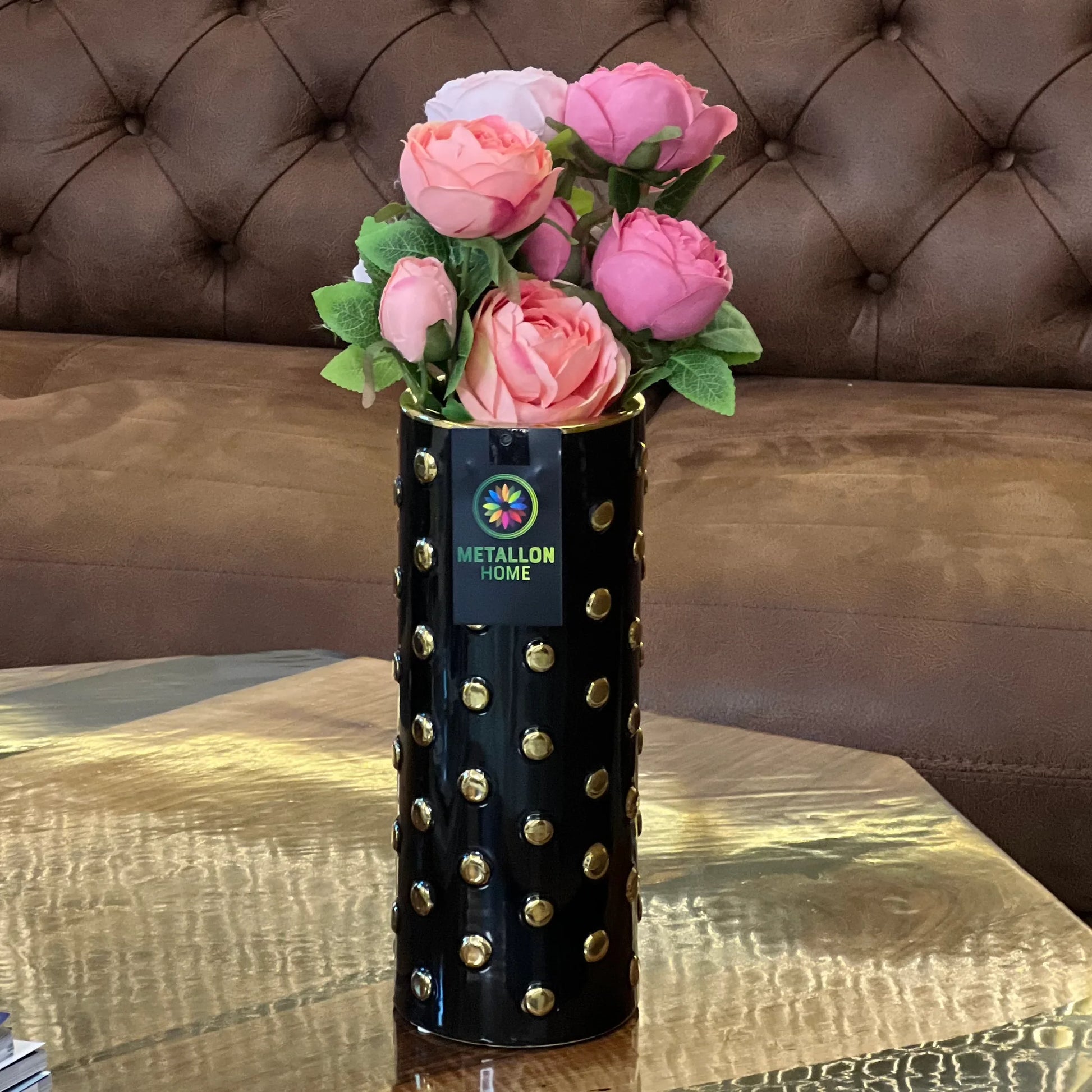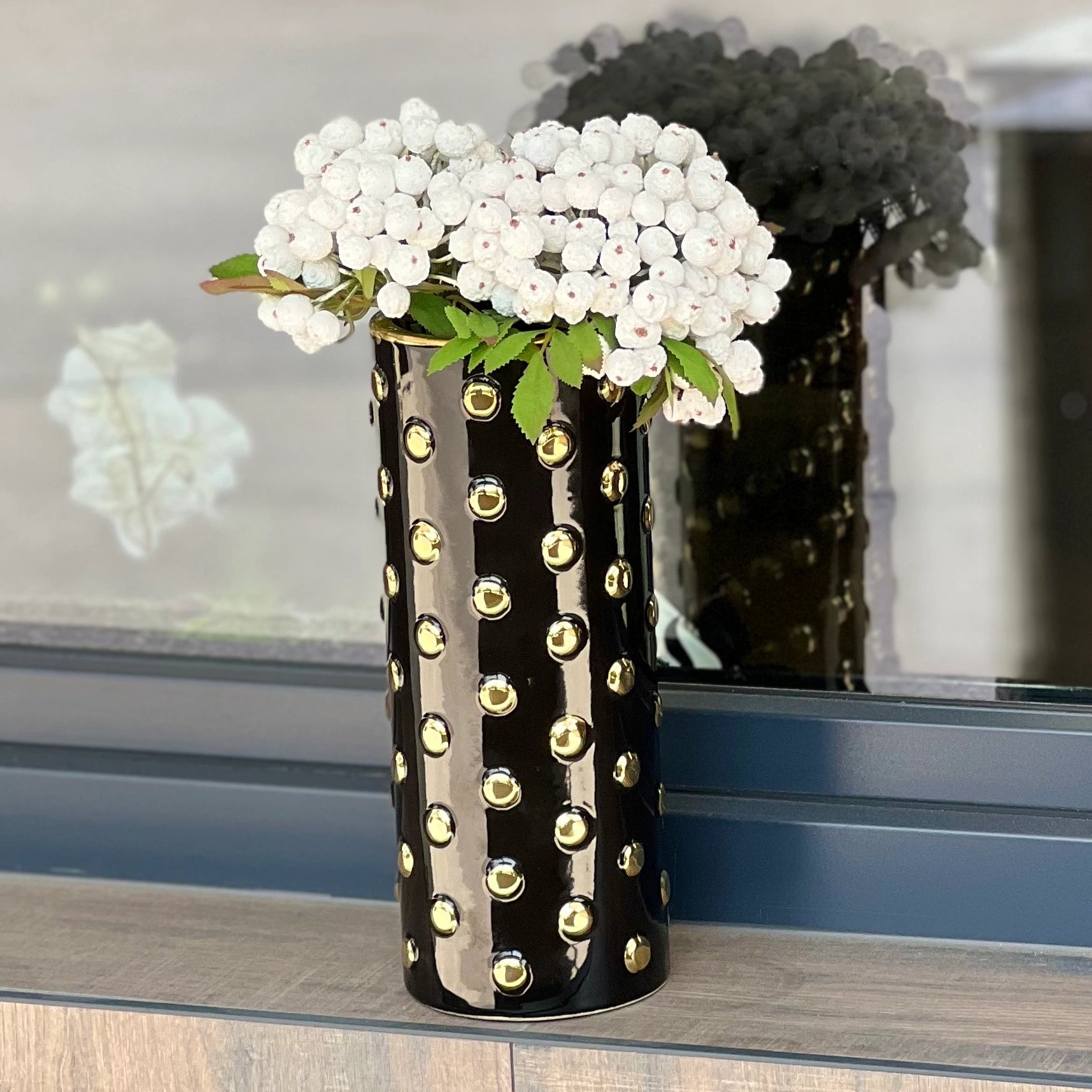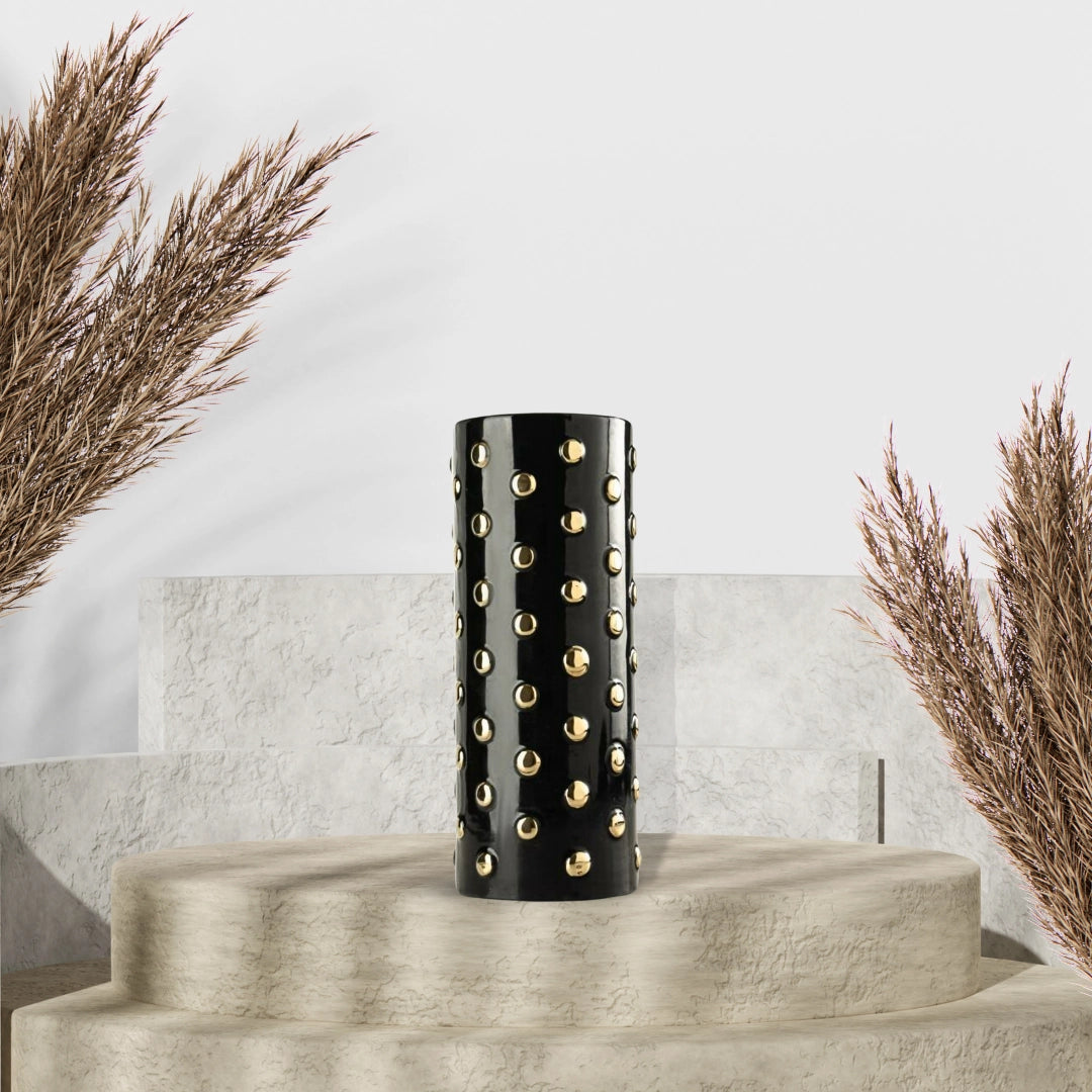 Dekorativna vazna Noir Dots je elegantna crna keramička vaza izduženog oblika, ukrašena suptilnim zlatnim tačkicama koje joj daju sofisticiran i razigran karakter. Idealna je za moderan enterijer s daškom glamura, bilo da se koristi samostalno ili kao dio seta.
