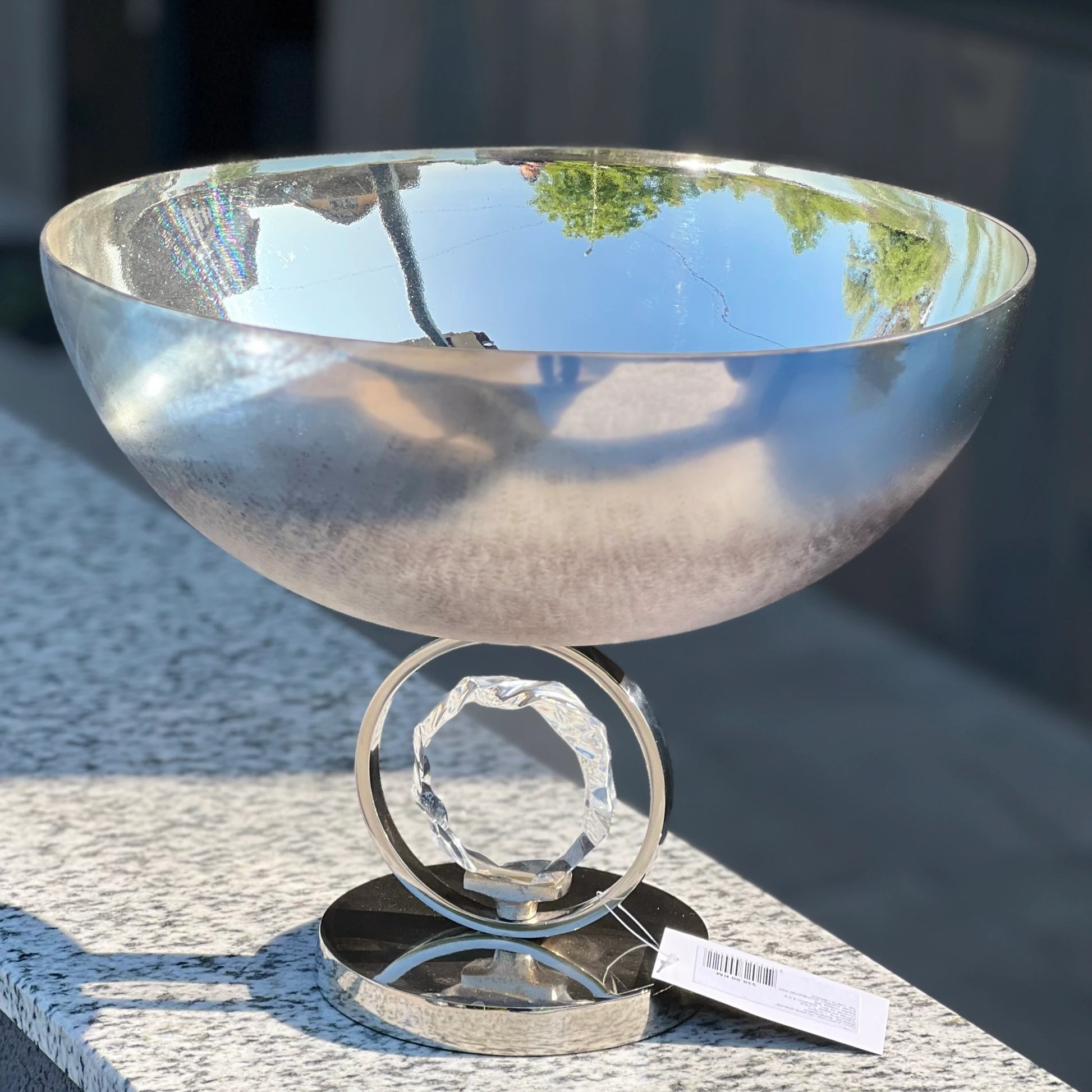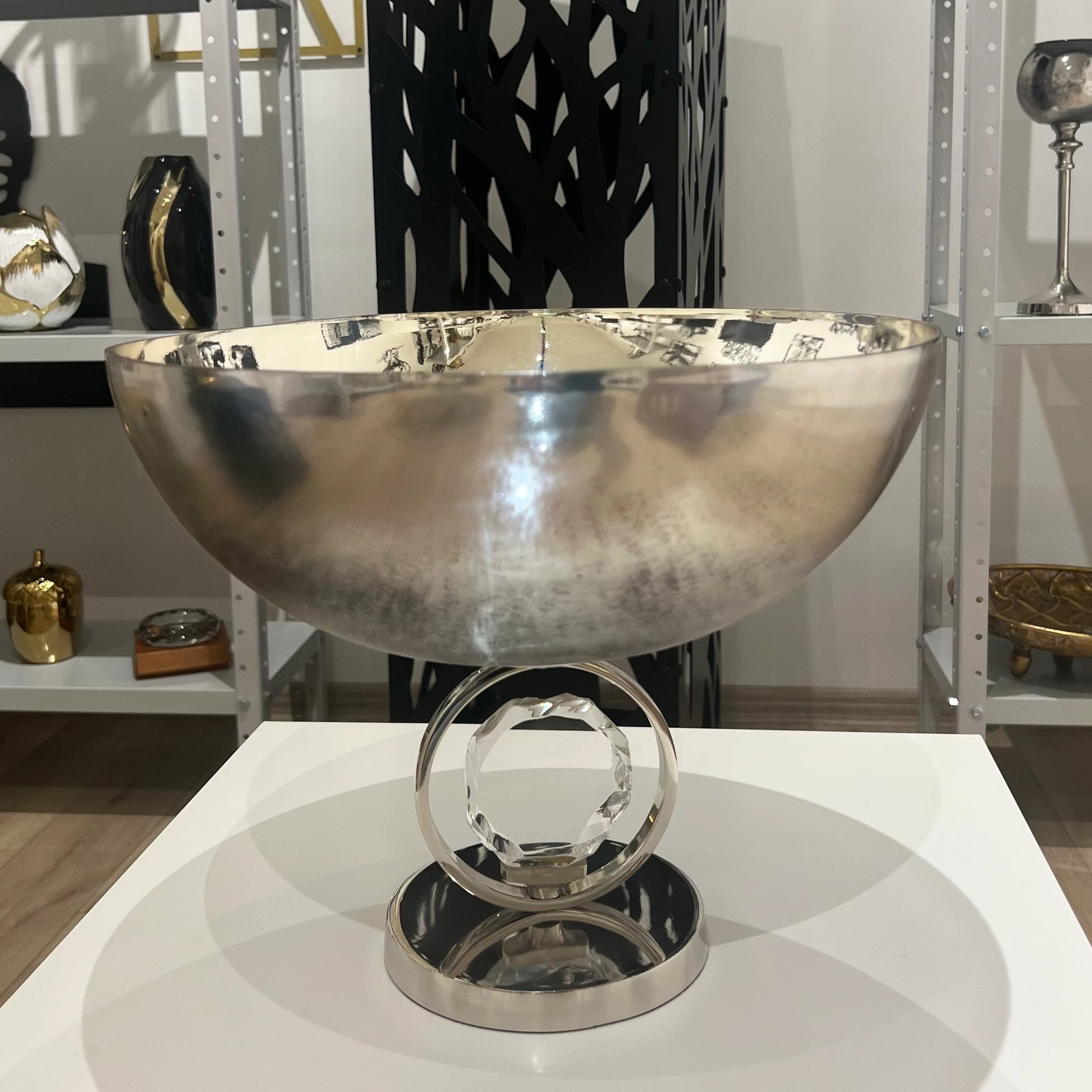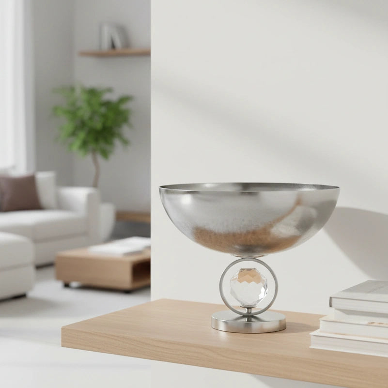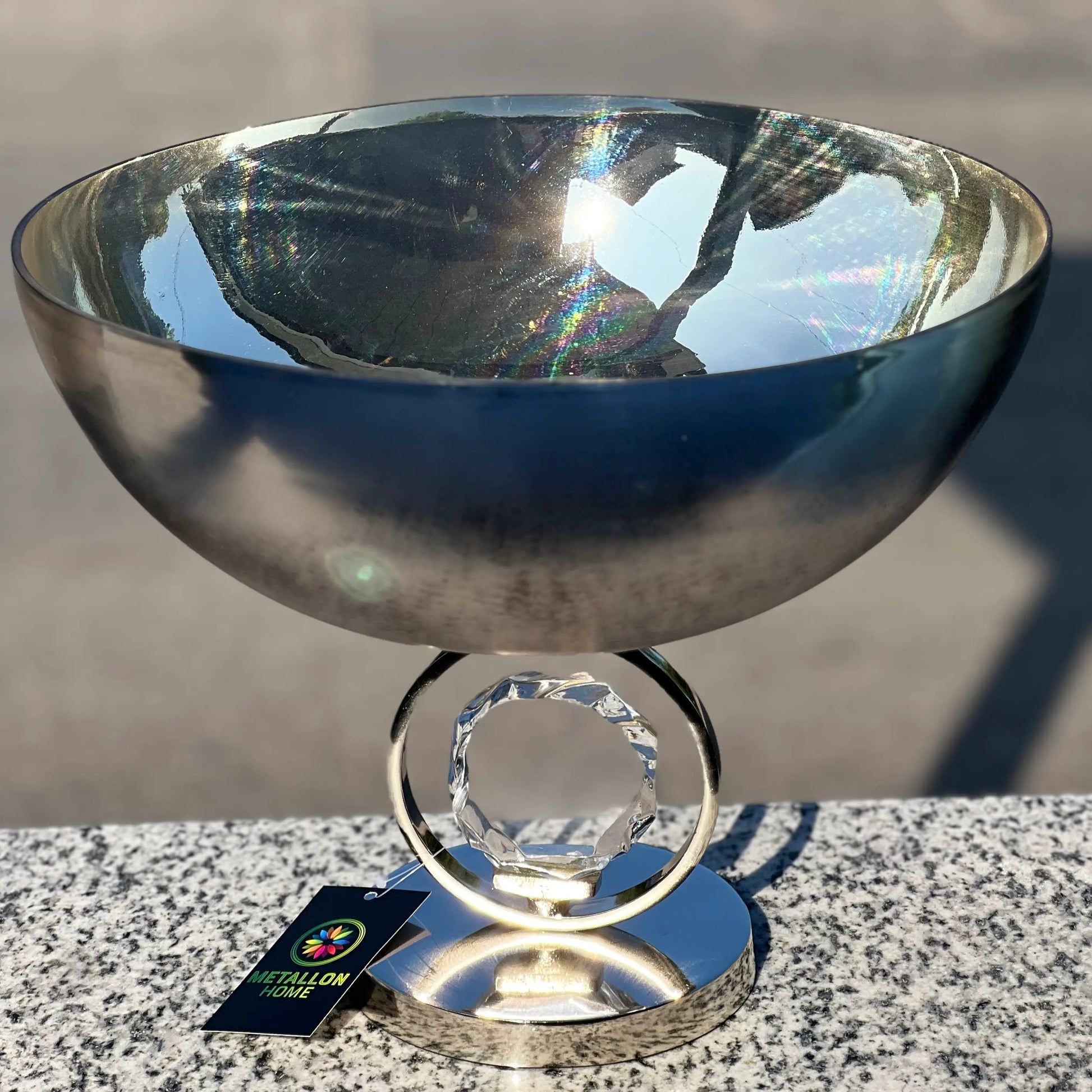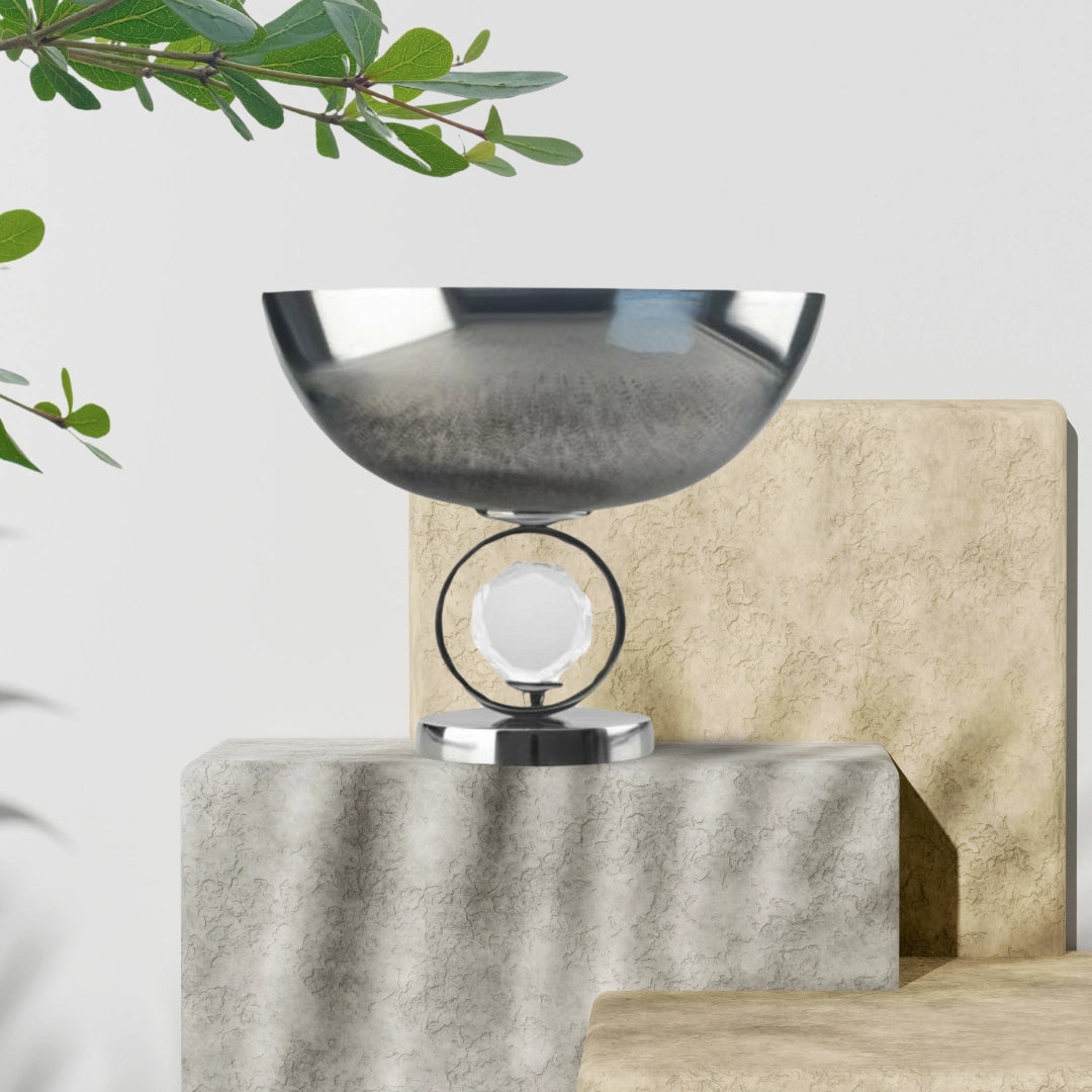 Dekorativna posuda Humatra je dekorativni komad snažne prisutnosti - izrađena od tamnog, gotovo crnog stakla u obliku pehara, sa zlatnom drškom i elegantnim crnim postoljem. Savršena za dodavanje doze glamura u enterijer, bilo da stoji samostalno ili kao centar pažnje na stolu ili komodi.