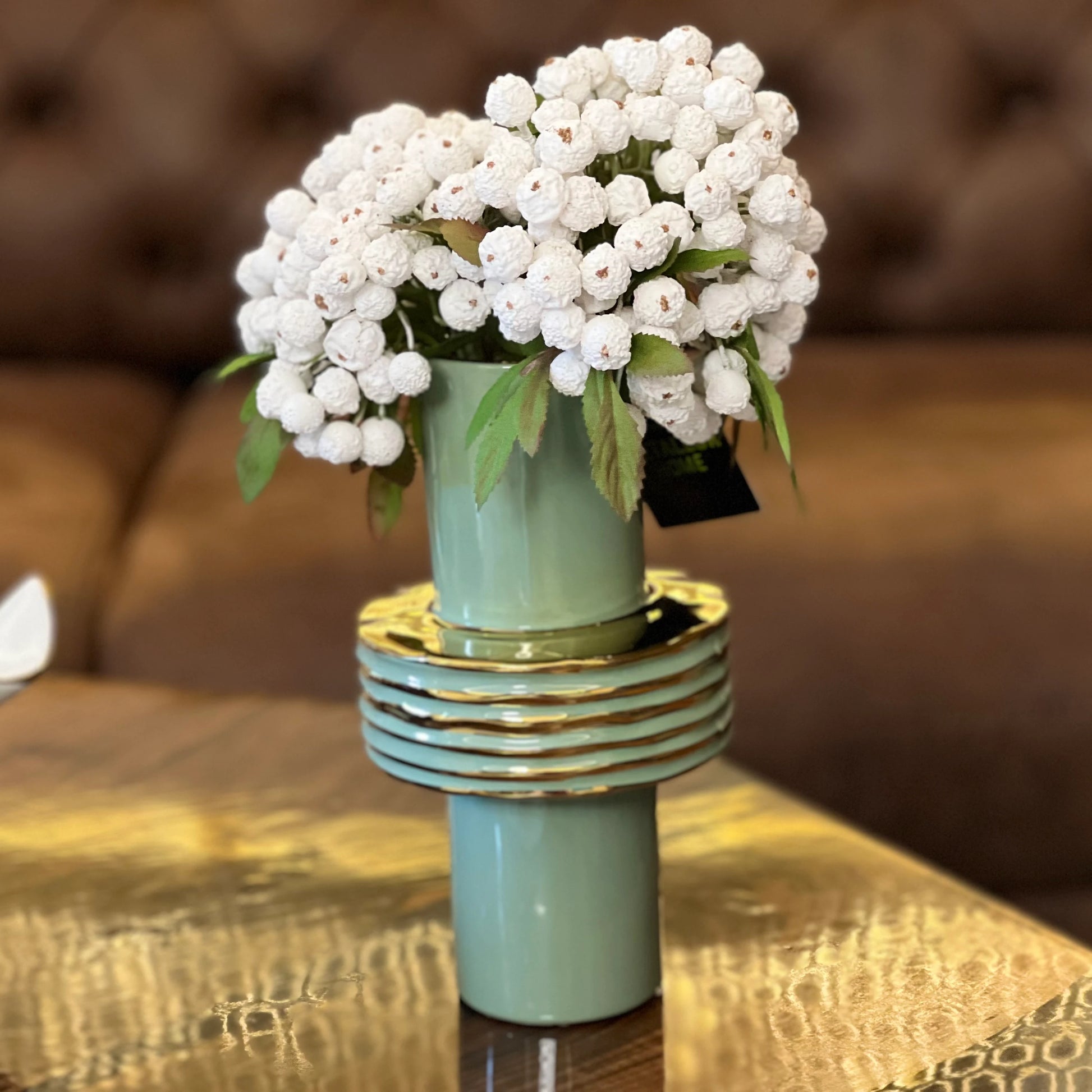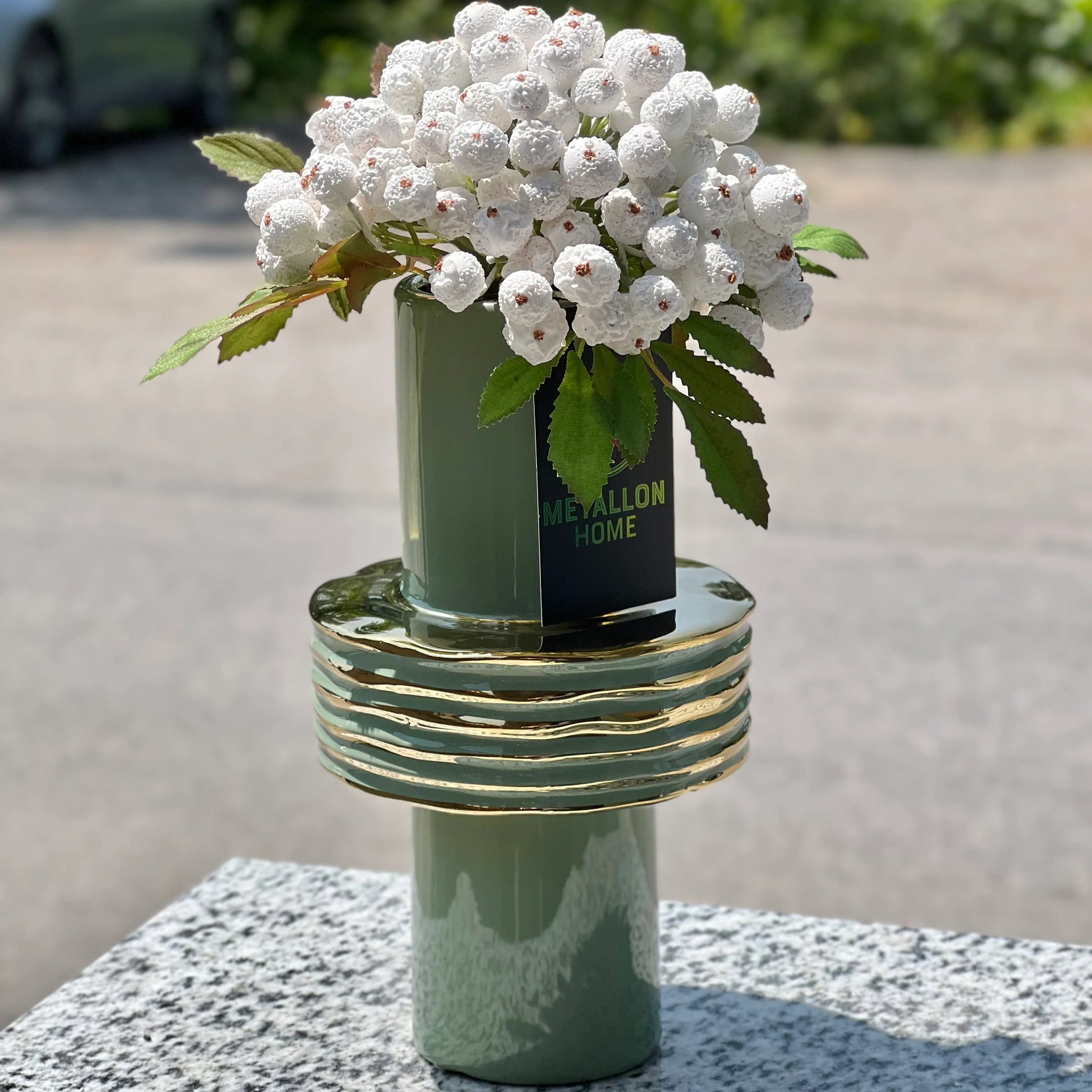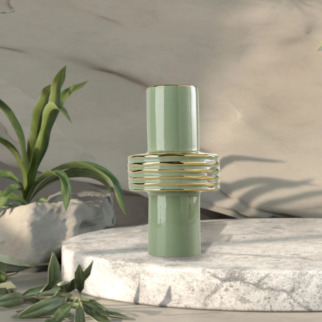 Dekorativna vazna Minté je izdužena porculanska vaza u nježnoj mint zelenoj boji, s elegantnim zlatnim linijama koje ističu zaobljeni detalj na sredini. Ovaj delikatan "struk" daje joj ženstvenu siluetu i čini je savršenim spojem moderne forme i klasične elegancije.