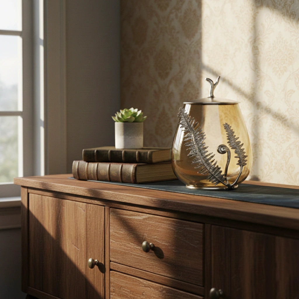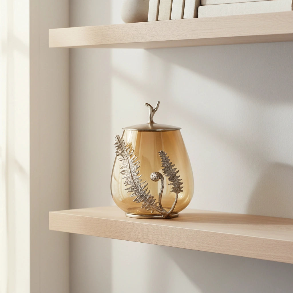 Staklena posuda Arbor donosi savršen balans između prozirne jednostavnosti i luksuzne osnove. Postavljena na elegantni metalni list, ova posuda podsjeća na to da i najfiniji detalji rastu iz čvrste osnove. Idealan dekor za sve koji vole spoj prirodnih motiva i modernog dizajna.