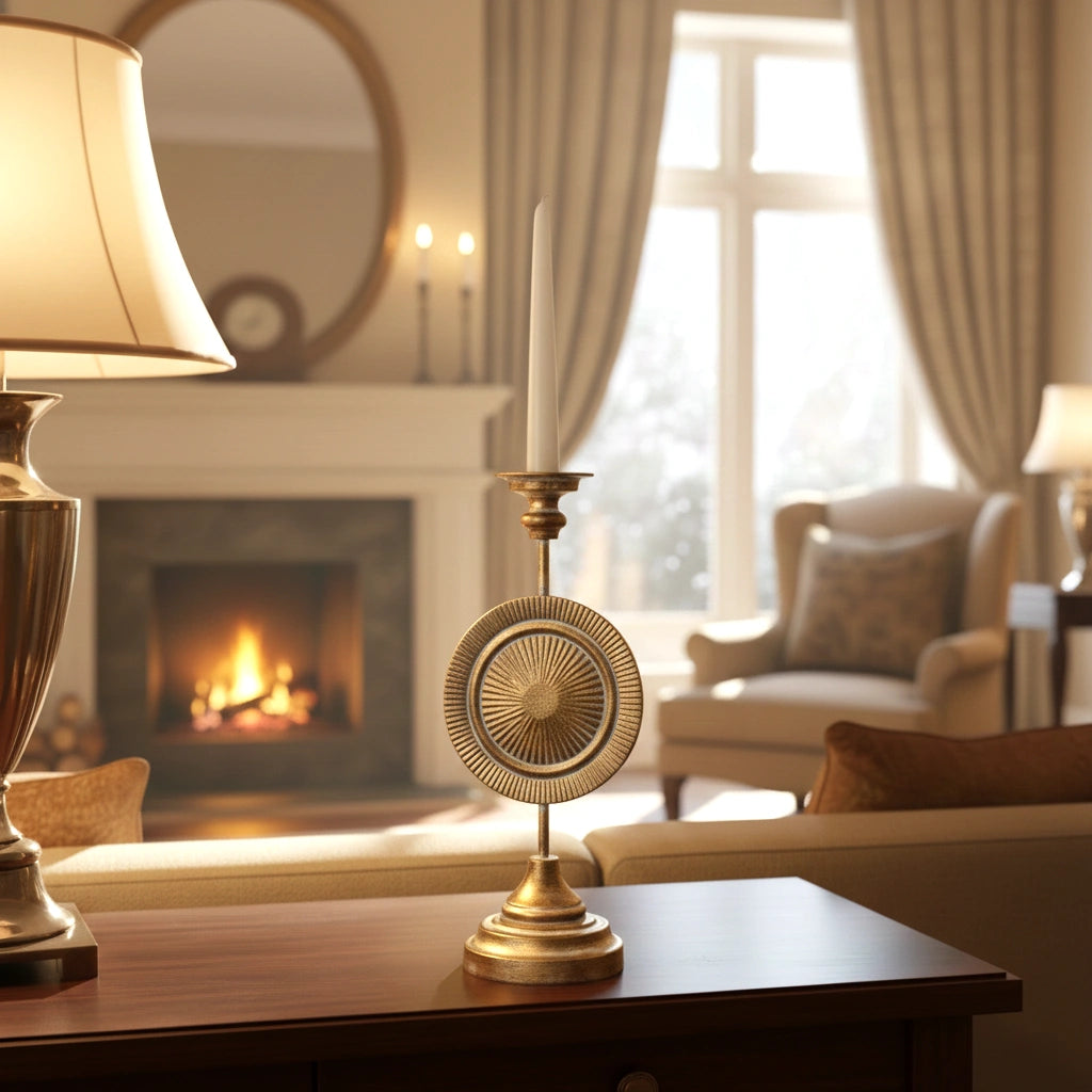 Ukrasna dekoracija Svijećnjak izrađena je od metala u izduženom obliku s dekorativnim krugovima, modernog dizajna koji unosi eleganciju i toplu atmosferu u svaki prostor.