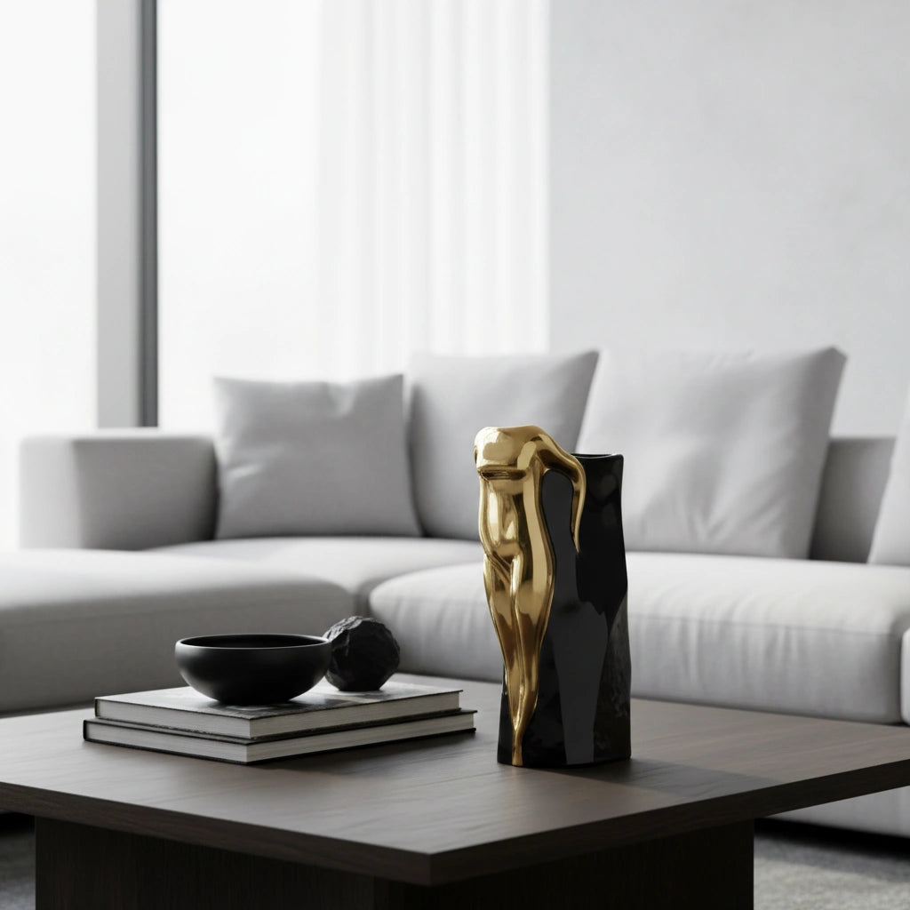 Ukrasna vazna Noir Muse kombinuje tamnu eleganciju s nježnim zlatnim akcentima u obliku stilizovane ženske figure. Dizajn je suptilan i sofisticiran – tijelo žene se nazire diskretno, bez eksplicitnosti, dajući prostoru umjetničku notu. Idealna za moderne enterijere kojima želite dodati dašak karaktera.