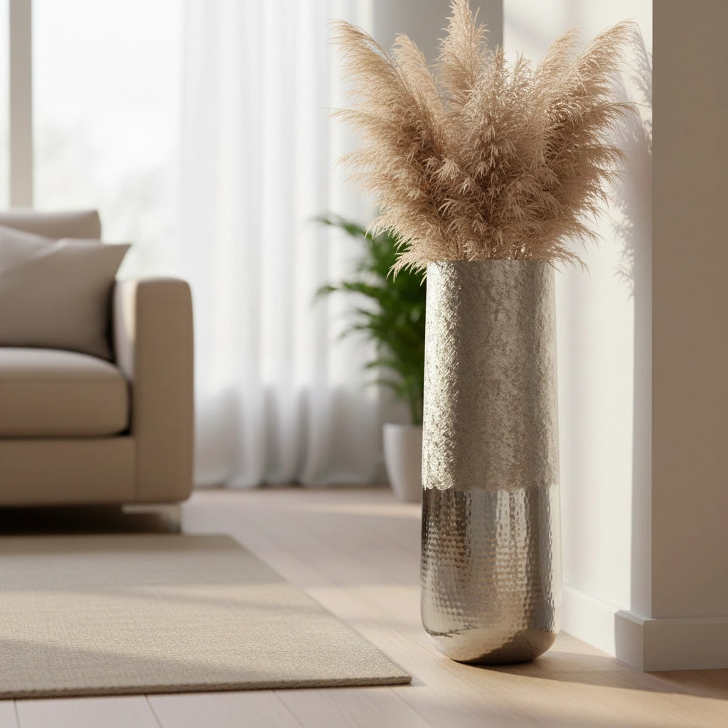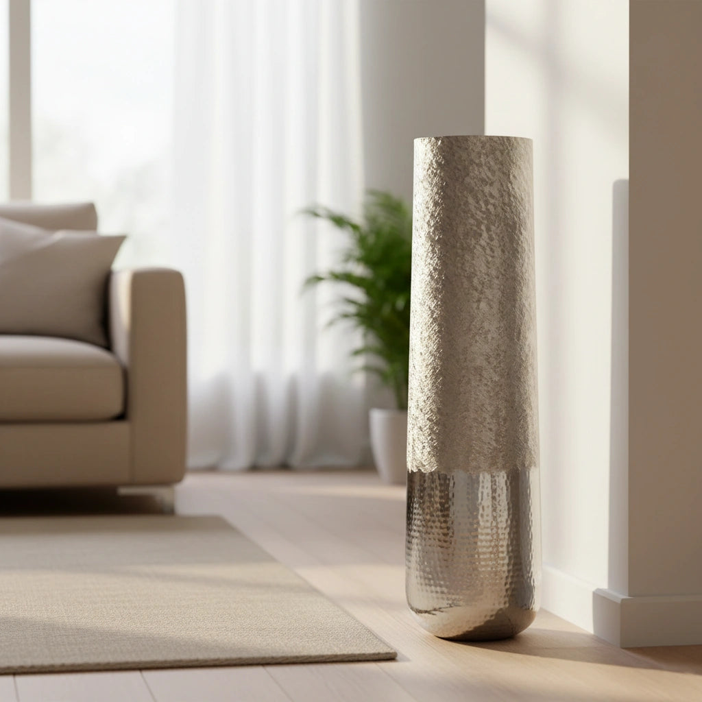 Ukrasna vaza Silver Deluxe velika je metalna vaza upečatljivog sjaja i impozantnog izgleda, savršena kao centralni dekorativni element u modernim i luksuznim prostorima.